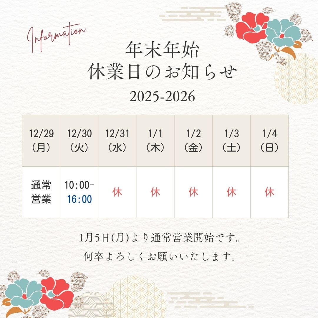 HOME > お知らせ > お知らせ2025~2026年末年始営業のお知らせ 2025-11-24 2025年もあと1カ月ということで年末年始営業時間のお知らせです。と、なっております。毎年最後の週は混みあいますのでご予約はお早めに…。 Twitter Share Pocket Hatena LINE コピーするこの記事を書いた人 井上洋人福岡県久留米市で唯一の”腰痛、坐骨神経痛、頭痛、姿勢改善”専門院エーパシの井上洋人 痛みの根本原因を探し出し結果をだす整体師 -お知らせ