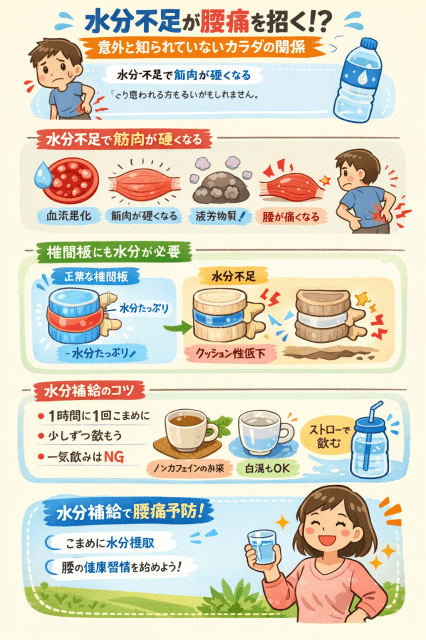 腰痛対策というと、ストレッチや姿勢改善を思い浮かべがちですが、水分補給も大切な予防習慣のひとつです。