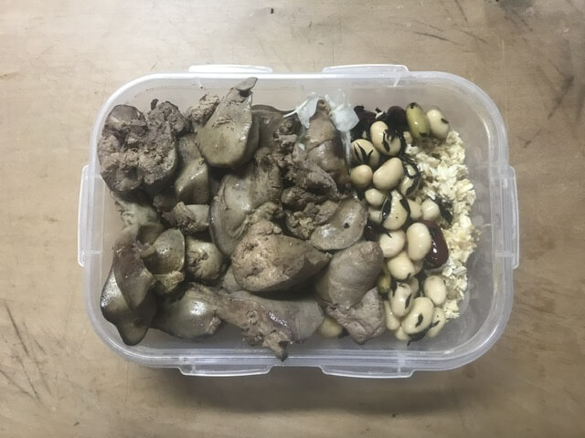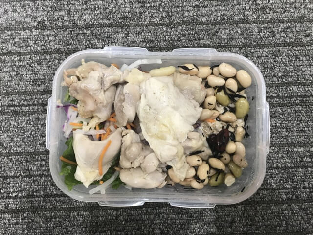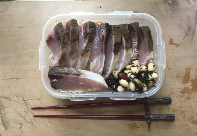このおかずたちの下にご飯があります。そして豆っぽいのは食物繊維目的です。そもそも火がちゃんと通っていなかったり、刺身をご飯の上に乗せたりと、とりあえず詰めればいい感が満載です。