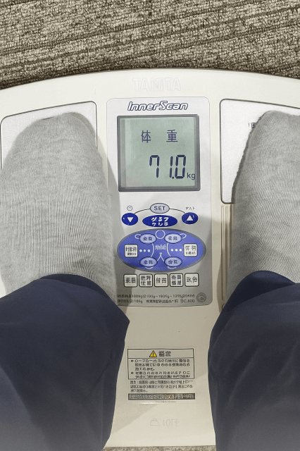 74.5kg➡74.1㎏➡72.8㎏➡71.1㎏と順調すぎるぐらい減っていましたが、今回はどうでしょう?